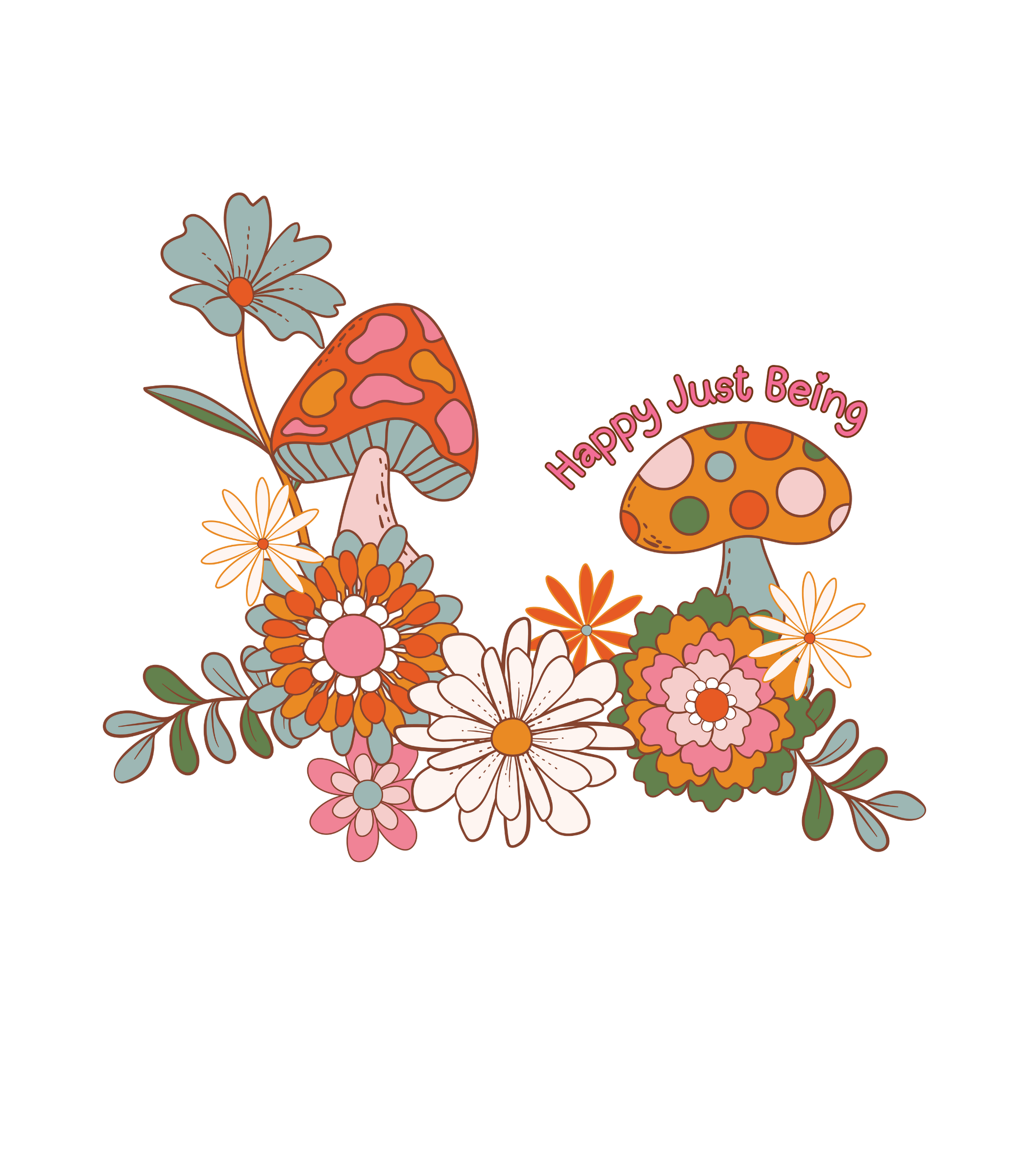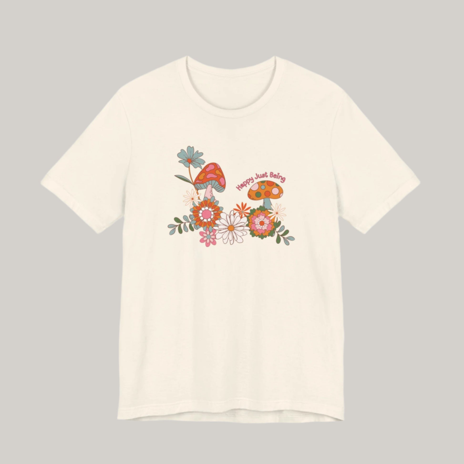 Retro Flowers T-Shirt - Flowers and Mushrooms - Happy Just Being - Unisex